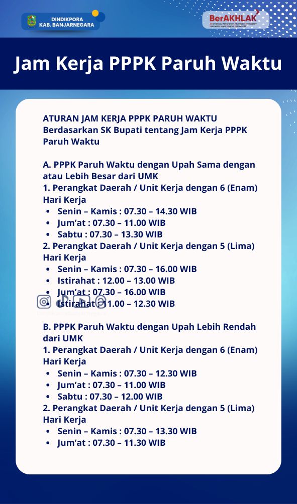 Dinas Pendidikan, Kepemudaan dan Olahraga (Dindikpora) Kabupaten Banjarnegara melalui Bidang Pendidik dan Tenaga Kependidikan (PTK) melaksanakan kegiatan sosialisasi jam kerja Pegawai Pemerintah dengan Perjanjian Kerja (PPPK) paruh waktu, Rabu (7/1/2026). Kegiatan ini digelar sebagai tindak lanjut kebijakan pemerintah daerah agar seluruh satuan pendidikan memiliki pemahaman yang sama terkait pengaturan jam kerja PPPK paruh waktu.